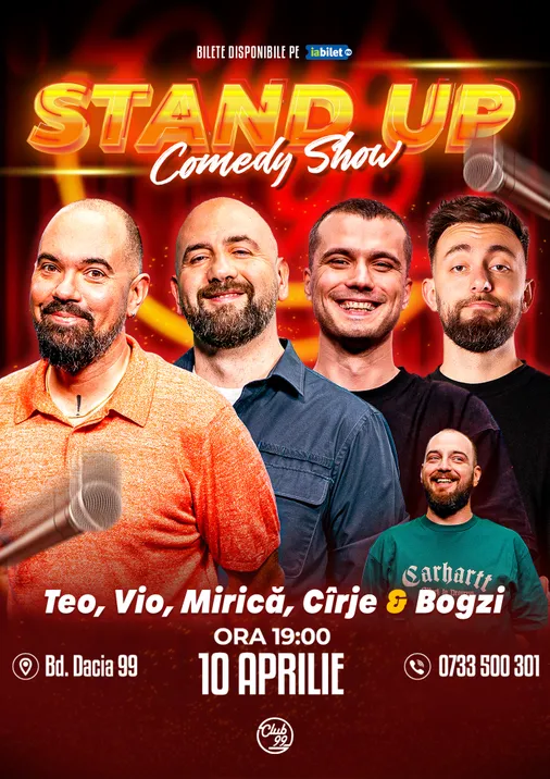 Vă așteptăm la o seară de stand-up comedy alături de Teo, Vio, Mirică, Cîrje & Bogzi